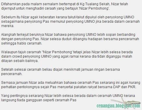 Yang lebih hebatnya ceramah tu bukan ceramah biasa Umno tapi ceramah dengan tema khas untuk membelasah Hj Nizar sendiri "Nizar: Pemgohong Bersiri"